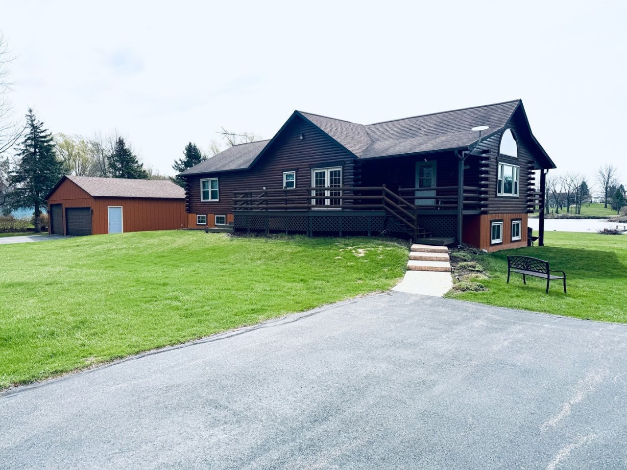 Tucked away on 2.3 scenic acres with your own stocked pond just steps from the backyard, this beautifully maintained raised ranch log home offers the perfect blend of rustic charm and modern comfort. Inside, you'll love the spacious open-concept kitchen and great room, designed for gathering and entertaining. The stunning Great Room features soaring 13-foot vaulted ceilings, rich wood car siding overhead, warm oak walls, and a cozy propane-burning stove that creates a true lodge-style atmosphere. A separate vaulted Den with 15-foot ceilings adds even more character and a versatile living space. The Kitchen shines with new countertops, a new refrigerator, and a convenient walk-in pantry/laundry room. The home offers 4 bedrooms, two full bathrooms, and a fully finished walkout lower level, providing flexible space for family and guests. In the lower level there is also a dedicated workshop space with workbench. Major updates provide peace of mind, including: Windows (10 years), Roof (8 years), Furnace & central air (5 years), Water heater (5 years), and Newer exterior doors. Quality craftsmanship shows throughout with six-panel pine interior doors, durable 2x8 wood foundation walls, and thoughtful details at every turn. Step outside to enjoy the covered back porch, perfect for relaxing and overlooking the water. The large stocked pond features a fishing dock and allows gas pontoons, kayaking, and canoeing, creating your own private retreat for year-round recreation. Car enthusiasts or hobbyists will appreciate the 32' x 24' detached three-car garage with a 10-foot overhead door and the double drive-ways. If you've been dreaming of peaceful country living with modern updates and room to roam, this one-of-a-kind property delivers space, comfort, and outdoor adventure all in one.