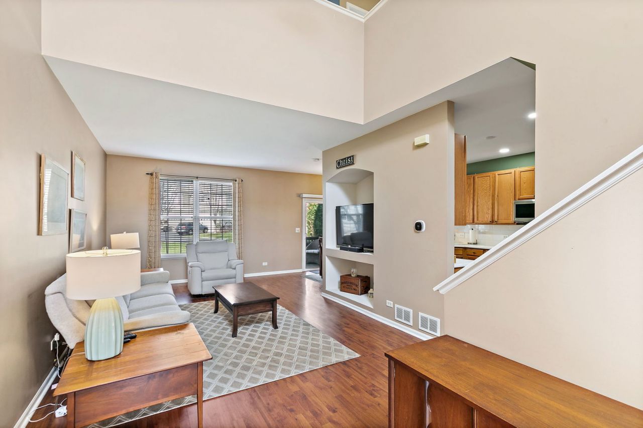 Beautiful two-story townhome in desirable Timber Trails featuring 2 bedrooms plus a spacious loft, a 2-car garage, full basement and overlooks open area and walking trail in backyard! This well-maintained home offers a perfect blend of space, style, and functionality. Step inside to a dramatic two-story foyer and enjoy 9-foot ceilings and wood laminate flooring throughout the main level, creating a warm and open feel. The spacious living room includes a built-in niche ideal for a TV or decor. The kitchen is well-appointed with stainless steel appliances, quartz countertops, tile backsplash, 42 cabinets, pantry, recessed lighting, and a dedicated coffee bar nook, perfect for everyday living and entertaining. The adjacent dining area opens to a private wood deck through sliding glass doors, ideal for outdoor dining and relaxation. A convenient powder room completes the main level. Upstairs, you'll find newer carpeting and a versatile open loft which is perfect for a home office, playroom, or additional living space. The primary suite features a walk-in closet and private full bath, while a second bedroom, full bathroom, and laundry room with shelving complete the upper level. The full unfinished basement offers endless potential - use it for storage, a home gym, or finish it to create additional living space. Recent updates include: furnace and A/C (2024), kitchen appliances (2020), washer and dryer (2020), ejector pump and sump pump (2019), deck stained (2025), and roof (2016). Enjoy a prime location with access to the Timber Trails walking paths and parks, nearby forest preserves, shopping, dining, and easy interstate access. A fantastic opportunity with space, updates, and location. Welcome home!