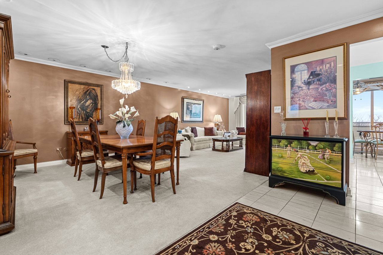 Regal Court spacious top floor unit with east facing views and 2 garage spaces. This elegant condo features 1755 sq. feet, a generous size living room, formal dining room, a galley kitchen with an adjacent breakfast room, a huge master suite with a dressing room, 2 closets and full bath with a walk in steam shower, a 2nd bedroom, hall bath, and laundry room with a full-size washer and dryer. Additional features include recessed lighting and cove molding in the living & dining rooms, marble in both bathrooms, custom light fixtures, and generous closet and storage space. Building amenities include a gracious lobby with a sitting room, party room, game room, exercise room and an outdoor pool to enjoy this summer!